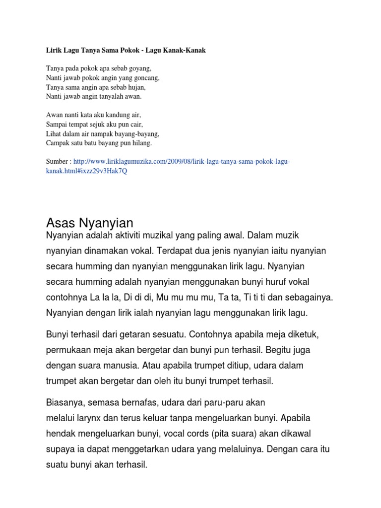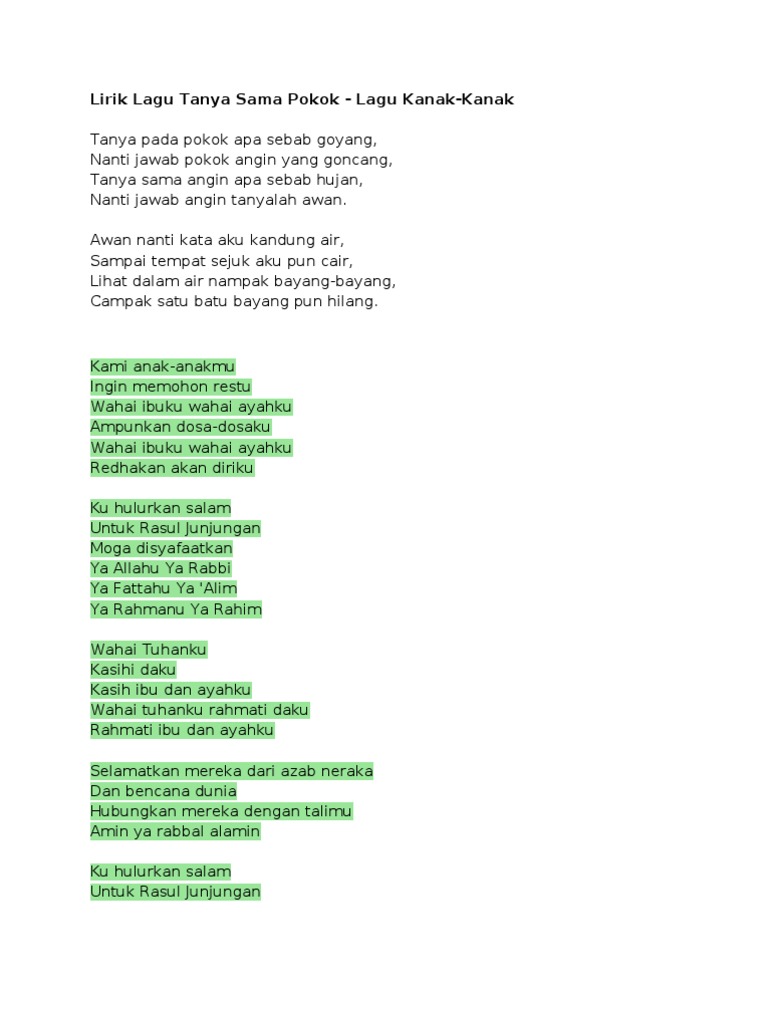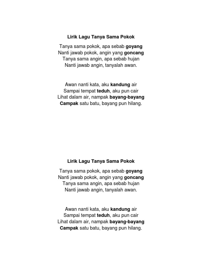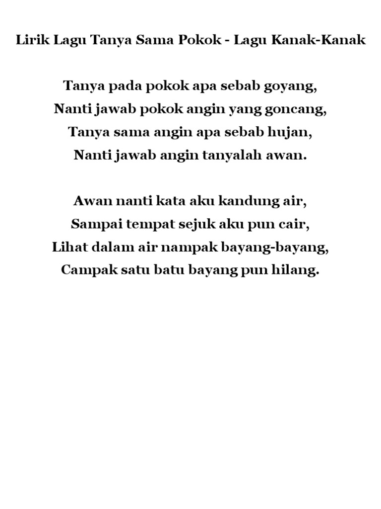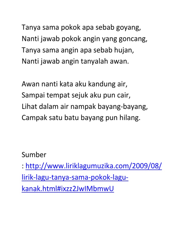 Tanyasamasampah transisitahun1 cikgunikskTRANSISI TAHUN 1Tema. Lirik Lagu Tanya Sama Pokok -Lagu Kanak-Kanak Tanya Sama Pokok Apa Sebab Goyang Nanti Jawab Pokok Angin Yang Goncang Tanya Sama Angin Apa Sebab Hujan Nanti Jawab Angin Tanyalah Awan. Tanya Sama Pokok-----Tanya sama pokokApa sebab goyangNanti jawab pokokAngin yang goncangWaaaaaaaaLa la la la la laTanya sama pokokApa sebab goyangNant.
